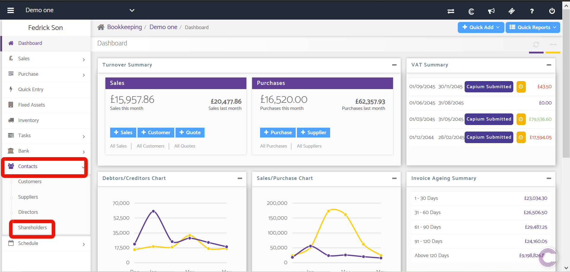 Location: Bookkeeping module > Dashboard > Client specific > Contacts > Shareholders