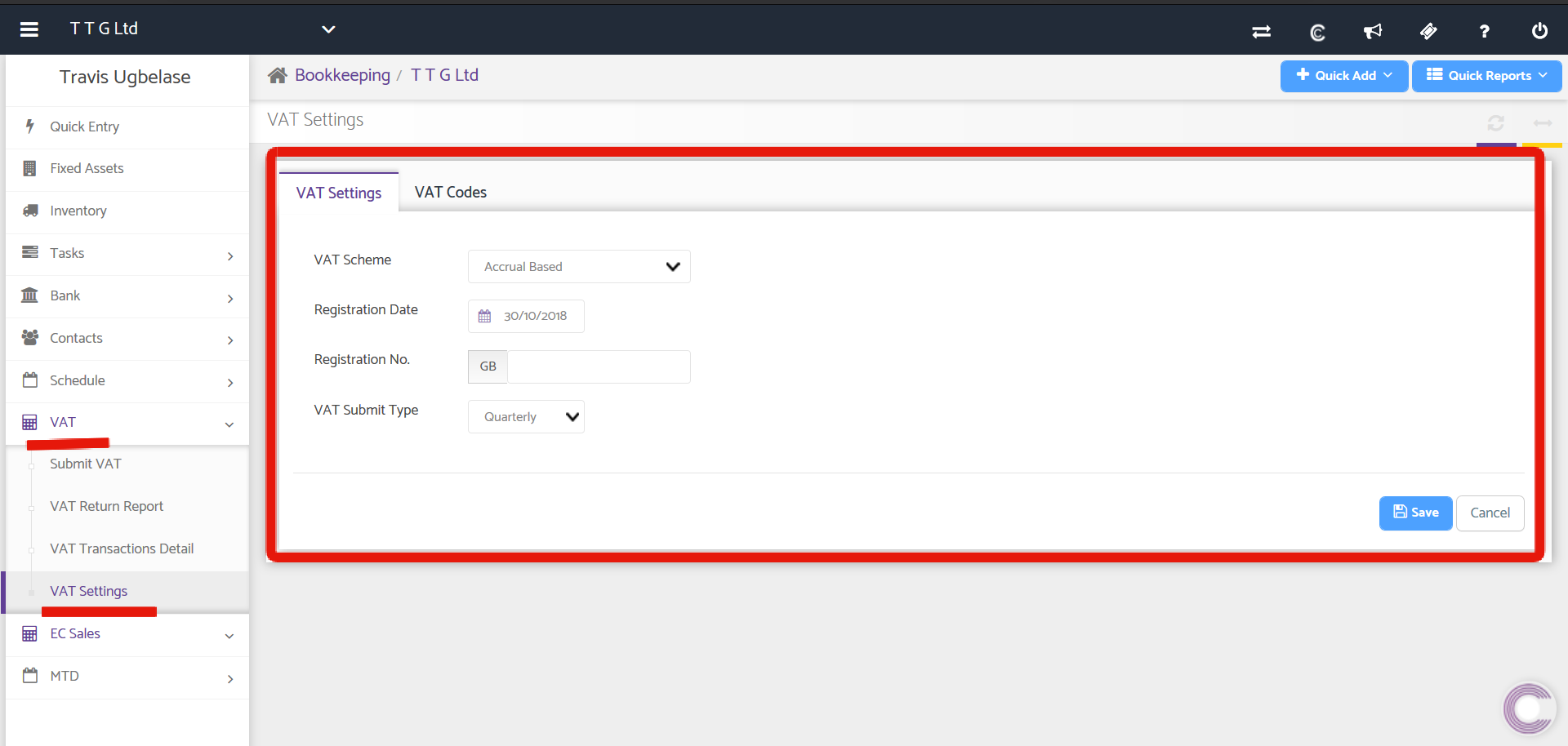 VAT Scheme: The different VAT schemes are listed under the drop-down such as Accrual Based, Flat Rate Accrual based, Flat rate cash based etc. you may update the same here or under Company Info.