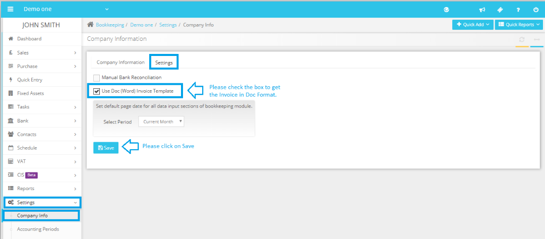 Navigation: Bookkeeping >> Settings >>Company Info >> Settings.