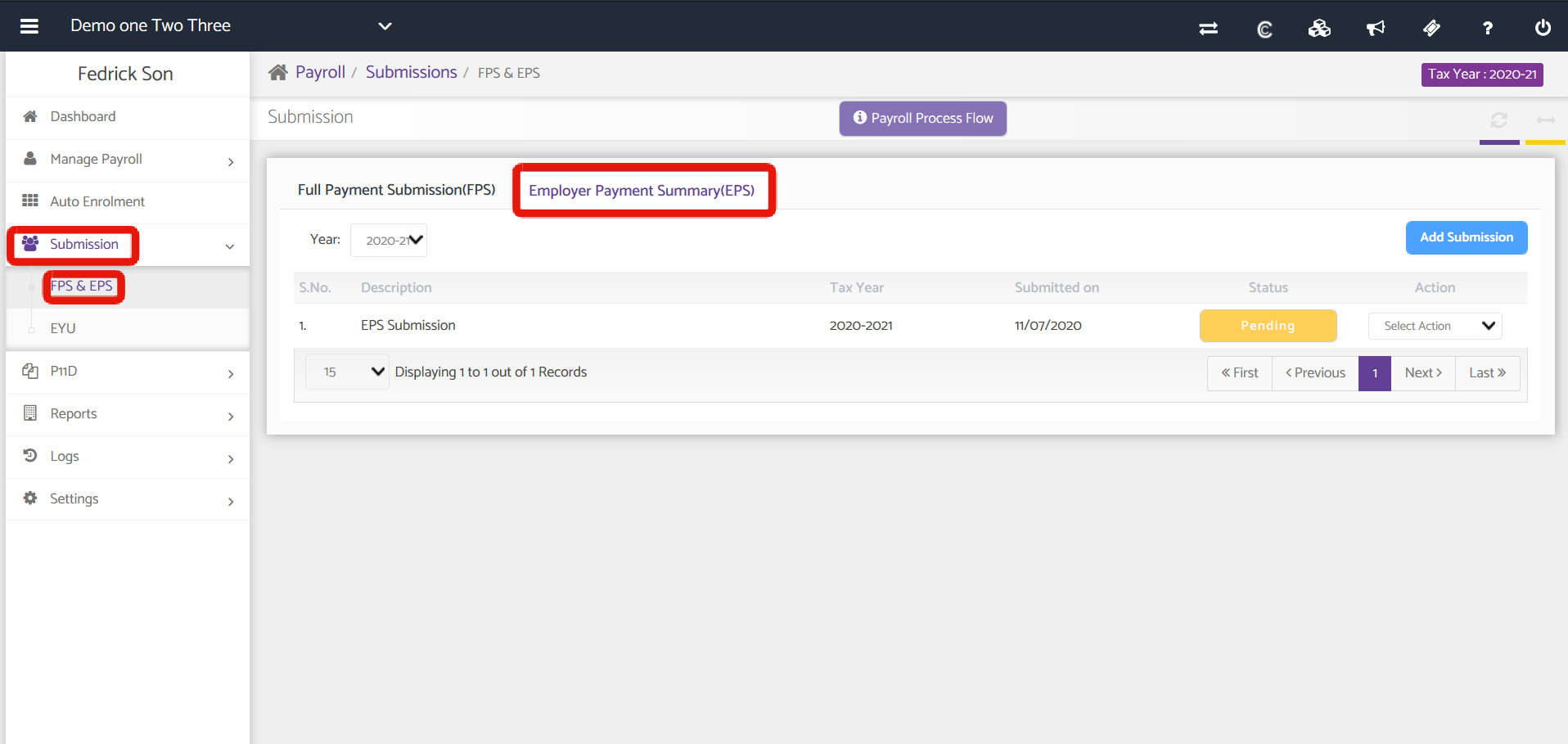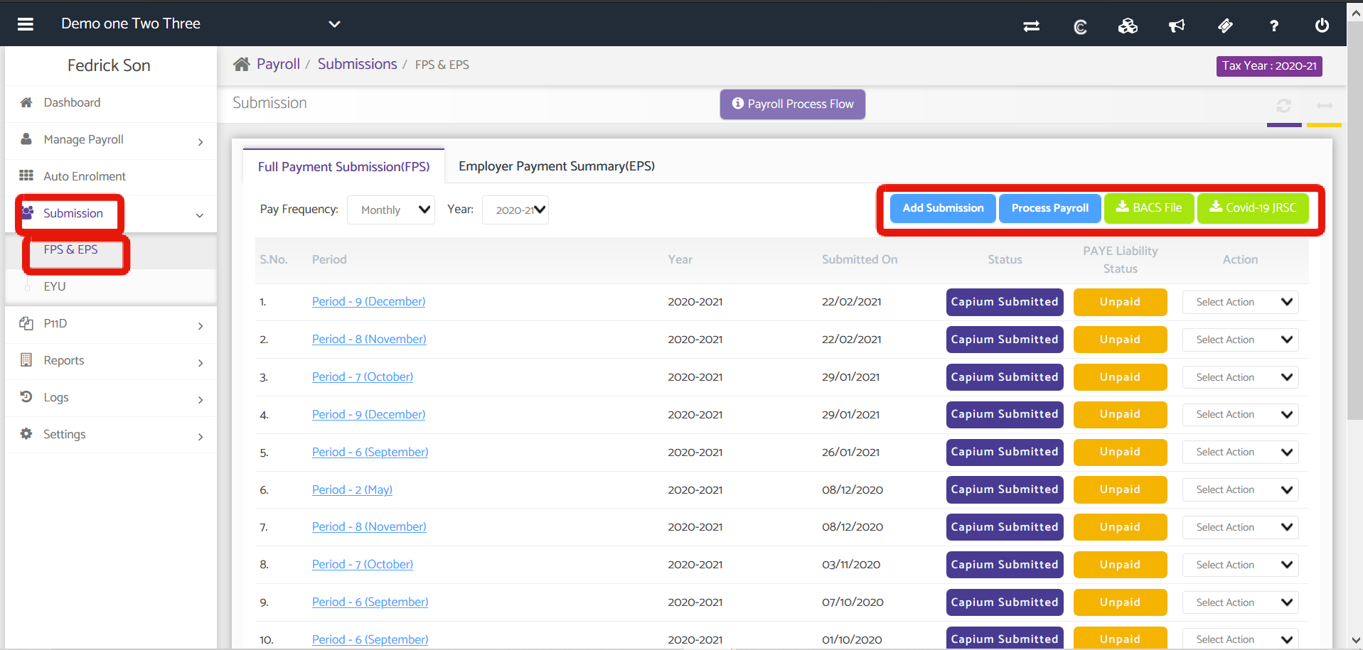 Submission tab enables you to submit the Full Payment Submission (FPS) for a particular period along with the Payment Submission Summary and also allows to Submit and Employment Payment Summary (EPS).