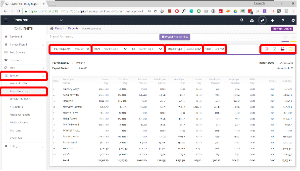 It shows the Summary of the Payroll submitted for a particular period. The Particular Period, Report Type, Pay Frequency etc. can be selected accordingly. Moreover, the same can be downloaded as a PDF or Excel sheet and you may also directly take a print or E-mail the same using the Icons available in the Upper Right Corner.