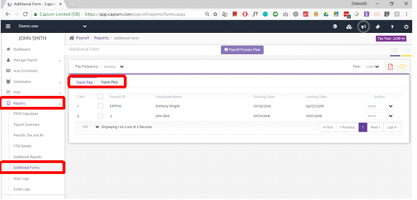 P45: You may download a P45 for a client when he is leaving the organization. You need to mention the leaving date of the Employee under the Employee Information. The Employee will be shown accordingly as per the relevant period.