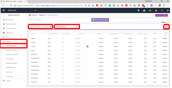 This Calculator shows you a projected PAYE report (Taxes and Net Pay) for the whole Tax Year (future periods) based on the Tax code, NI Category, Gross pay, Employer NI contribution, Employee NI contribution, the student loan of the Employee if any. All the details can be viewed for a particular Employee by selecting the same from the dropdown available on the upper left corner and a PDF of the calculation can also be downloaded by clicking on the upper right corner of the page.