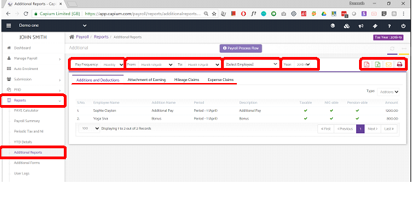 In this section, you can view the details regarding the Additions and Deductions, Expense claims and Mileage Claims for a particular Employee. You may also download the details in the form of a PDF or Excel Report and also E-mail the same.