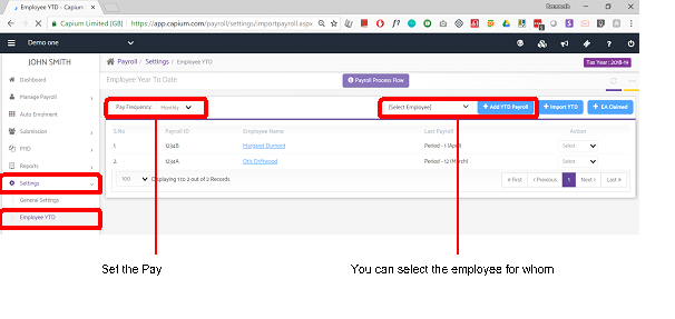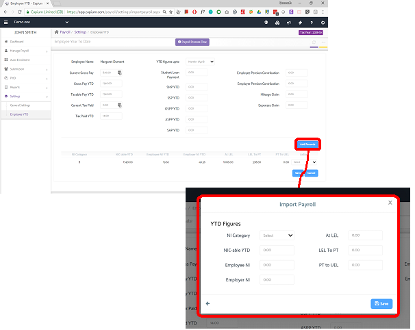 This section will help you maintain the Year to Date pay data of the employees. When you start using ‘Capium Payroll’ part-way through the tax year, you need to enter the YTD details of existing employees to ensure accurate pay details (YTD figures in Payslips and values in different cumulative reports) are maintained and reported to HMRC.