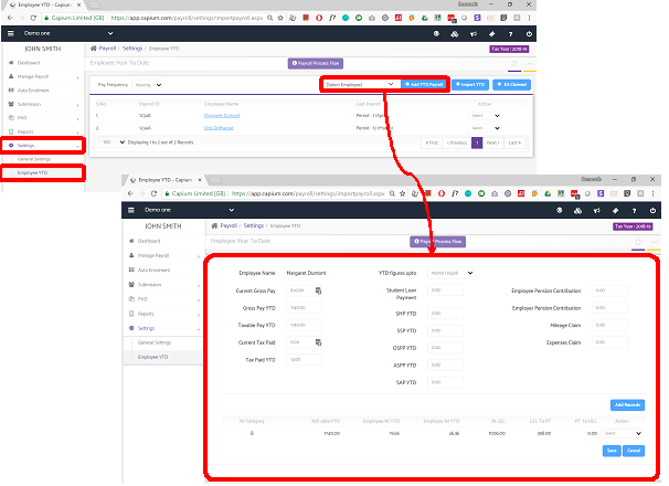 Run the previous periods’ payroll and submit them as ‘Capium Submit’. By this way year to date pay details will automatically have calculated and will show in relevant reports (The Employee YTD section is useful for only this type of Employees), or