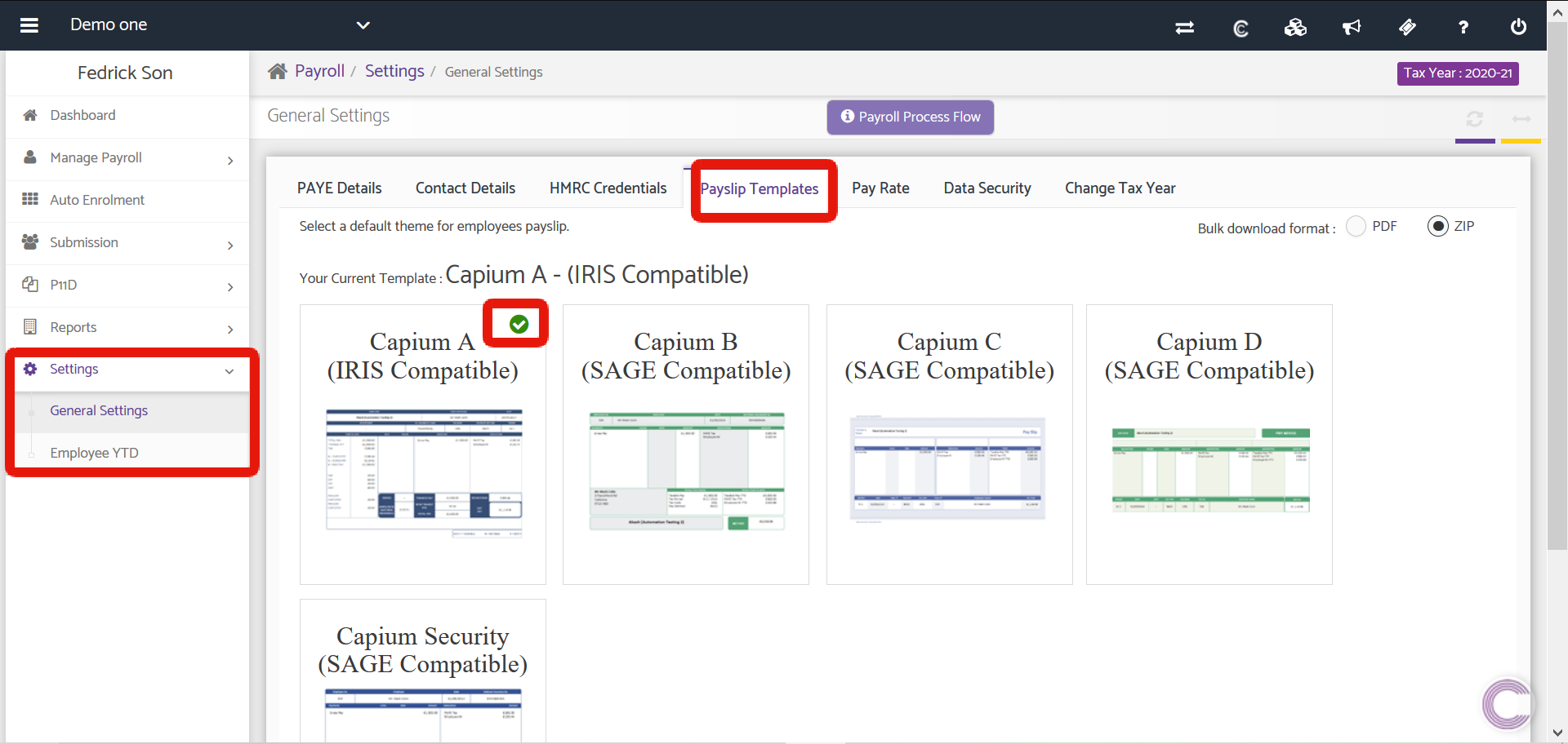 From here you can make any Payslip style theme as a default theme by selecting from available options. However, you will be able to select any of the Payslips themes available while exporting the same. The Green tick signifies the current template.