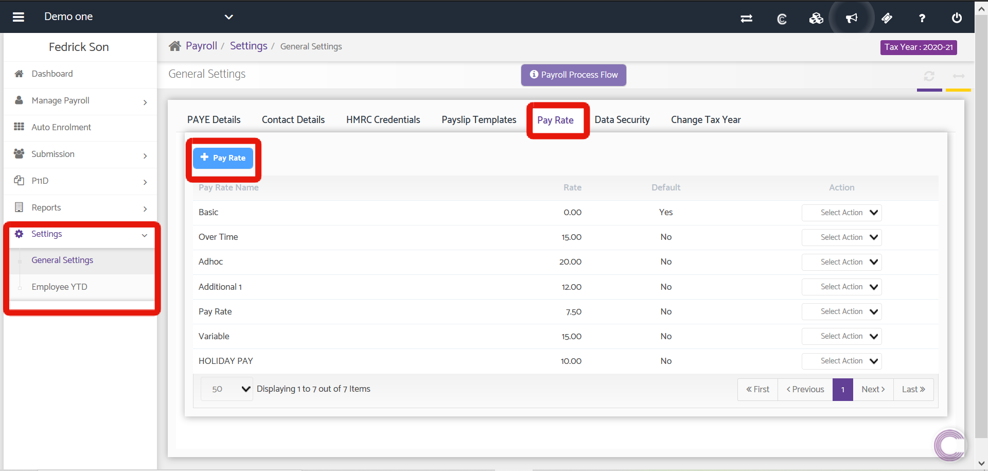 In this section, you may update the Pay rates such as Basic, Over Time, Adhoc. You may set the pay rate default and it is able to edit or delete with the help of select action drop-down.