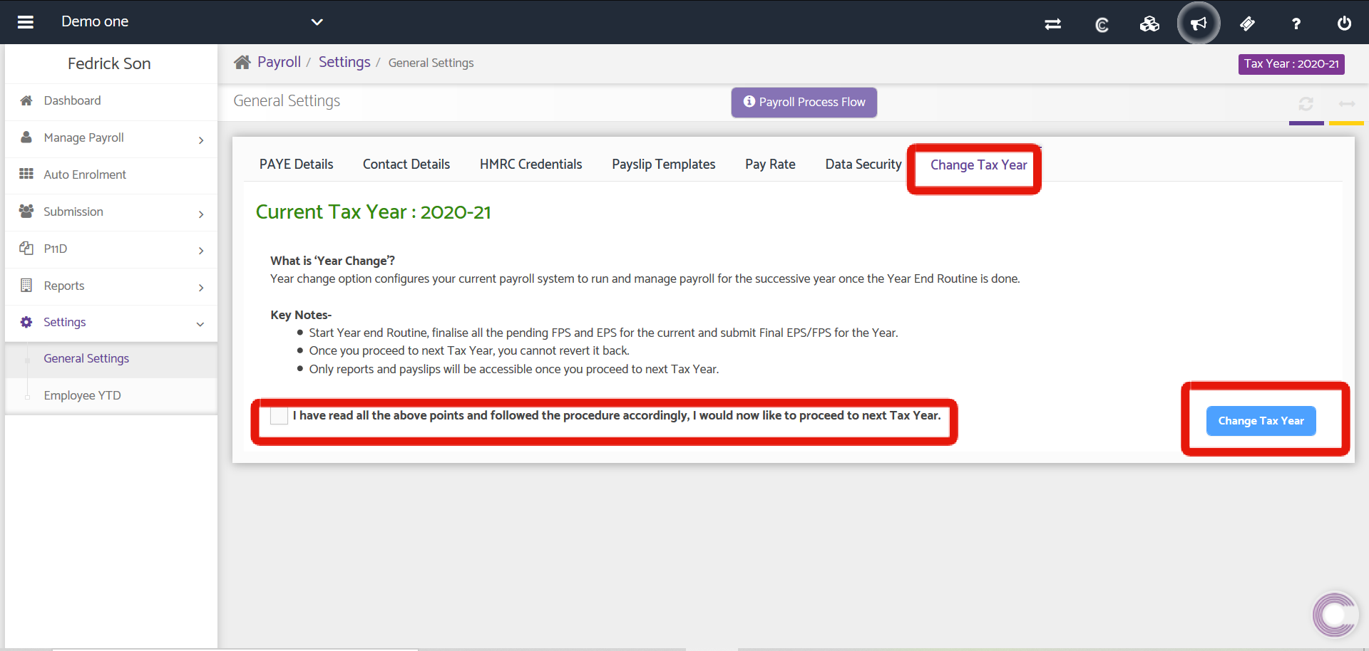 From here you can move to the next Tax year. Year change option configures your current Payroll system to run and manage Payroll for the successive year once the Year End Routine is done. Once the Year End Routine has been initiated, finalise all the pending FPS and EPS for the current year by either submitting them to Capium or HMRC, only then you may change the current tax year. Once the current year is changed to the successive one, it cannot be reverted back. Only reports and Payslips will be accessible for the years before the Current year.