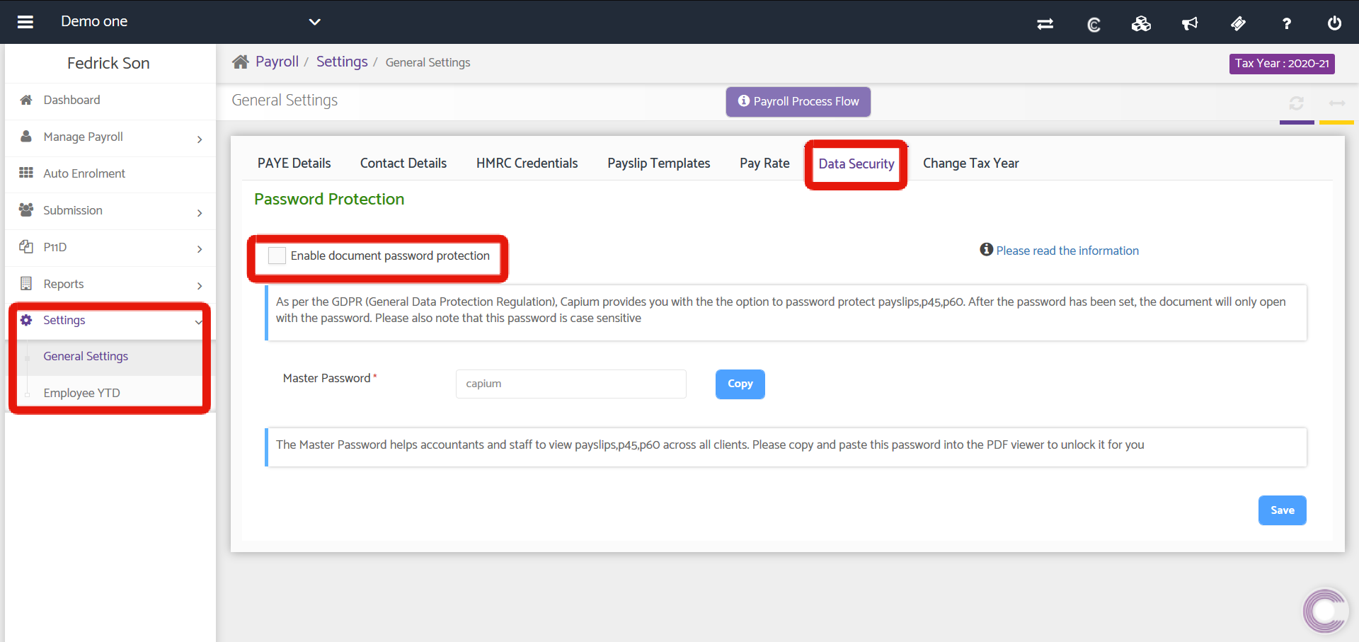 Here, you are able to enable Document Password for Payslips, P45 & P60. Simply select the checkbox to enable and this will be applied to all employees. There is also a master password which allows the Super Accountant to access any document with the password, however, individual passwords will also need to be created from Manage Payroll > Employees > Edit Employee