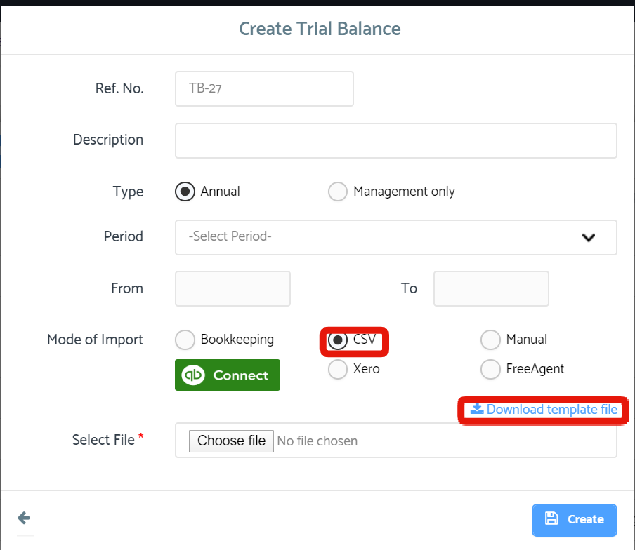 Accounts Production>>Select the Client >>Tasks>>Trial Balance>> +Trial Balance (Blue Button) and then choose the Mode of Import as CSV.