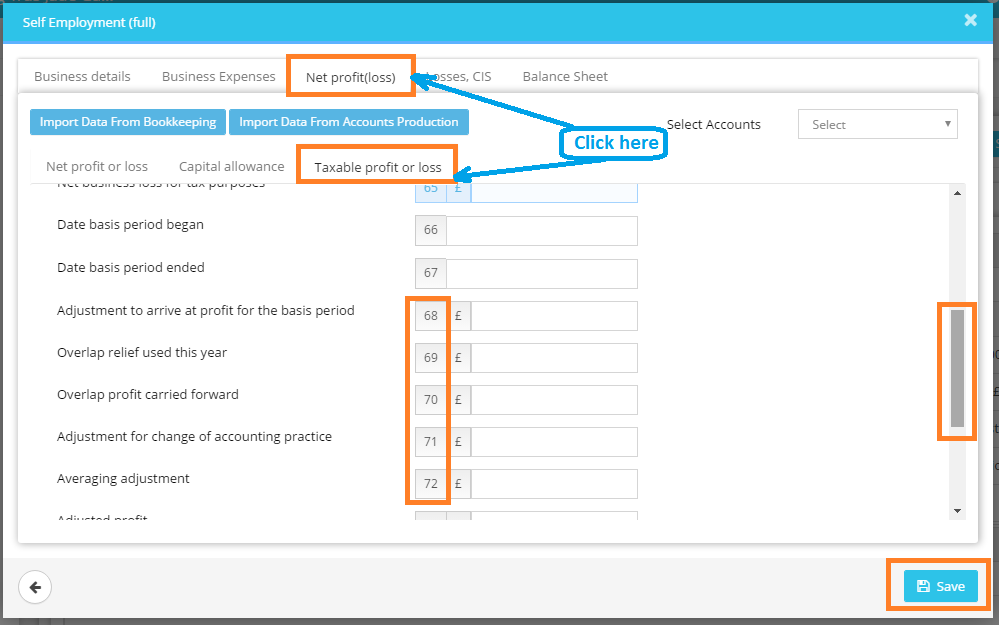 You may simply click on "taxable profit or loss" tab "net profit loss" tab and then scroll down the window to input the values in box no. 69-72 as desired.