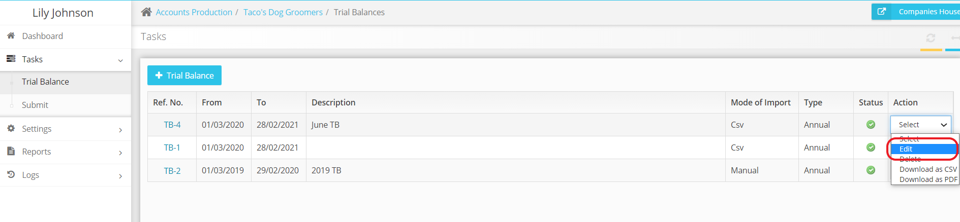 Please click edit under action dropdown and a TB created from CSV, Xero, QuickBooks or Manually