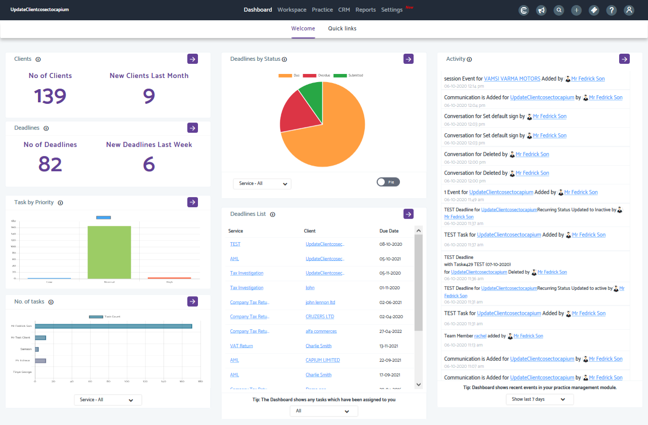 You can see Number of clients and new Clients last month as well as number of Deadlines and new Deadlines last week. You will also be able to see a Deadlines by status chart, Tasks by Priority Chart, No of Tasks chart, Deadlines list and an Activity list.