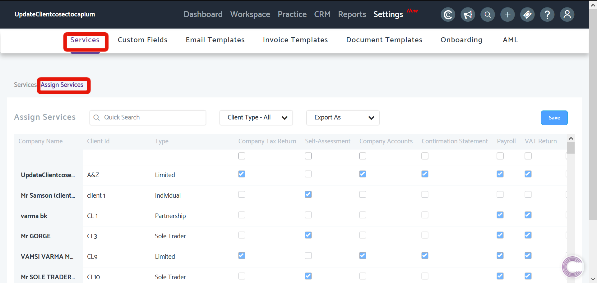 Before adding a deadline, you must assign the relevant Service to your clients from Settings > Services > Assign Services. In this section, you will find a grid view of your clients to the left and the services above, simply tick the checkboxes to assign those services to your clients.
