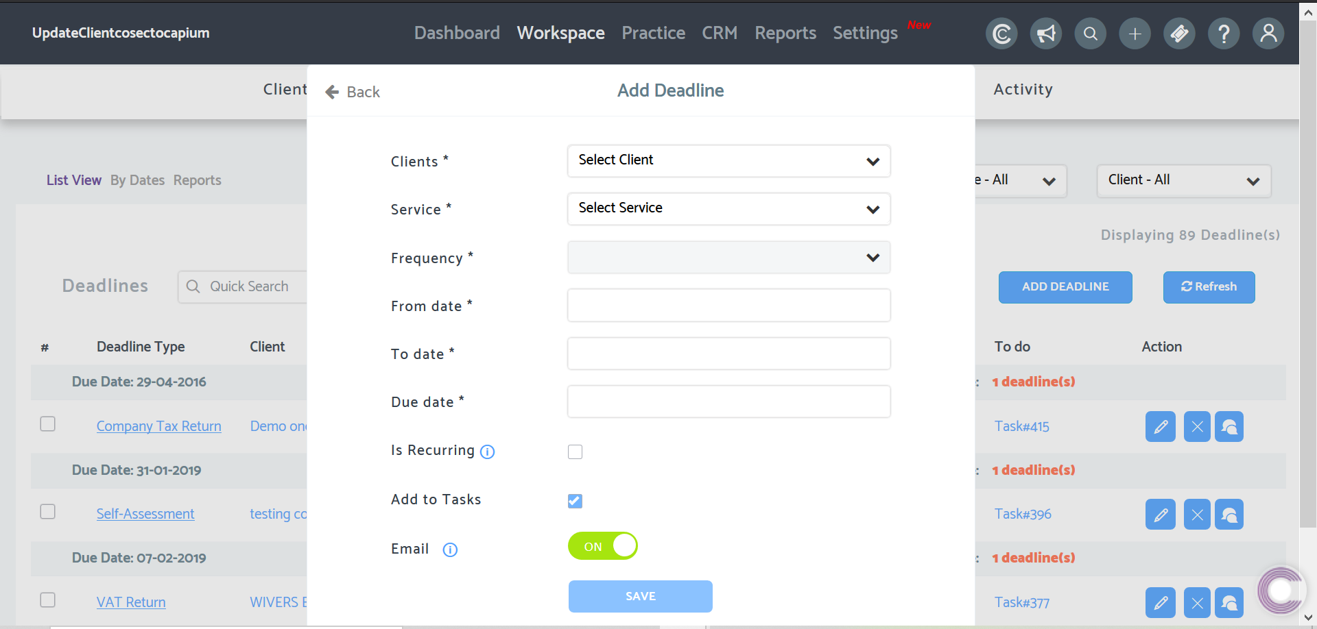 Once you have assigned relevant the service(s), you can now begin the process of setting up Deadlines. Head to Deadlines under Workspace and click Add Deadline once there.