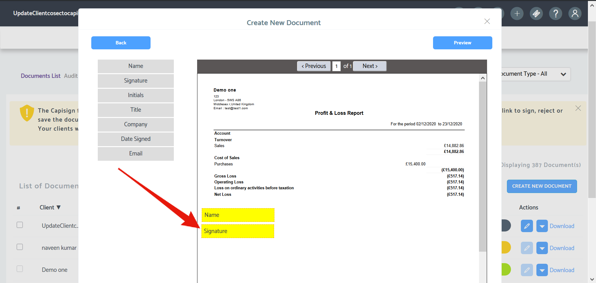 - The document can be signed by double-clicking on the tags, a pop-up appears where the client can manually type in their name to sign.