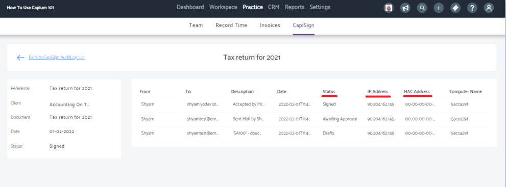 You can create and send documents for E-Signing through CapiSign. Using the feature, accountants can send documents such as Accounts Report, CT600 or any other important documents to their clients for electronic signatures. And it will also cover the client authorisation for the submissions to Companies House or HMRC.