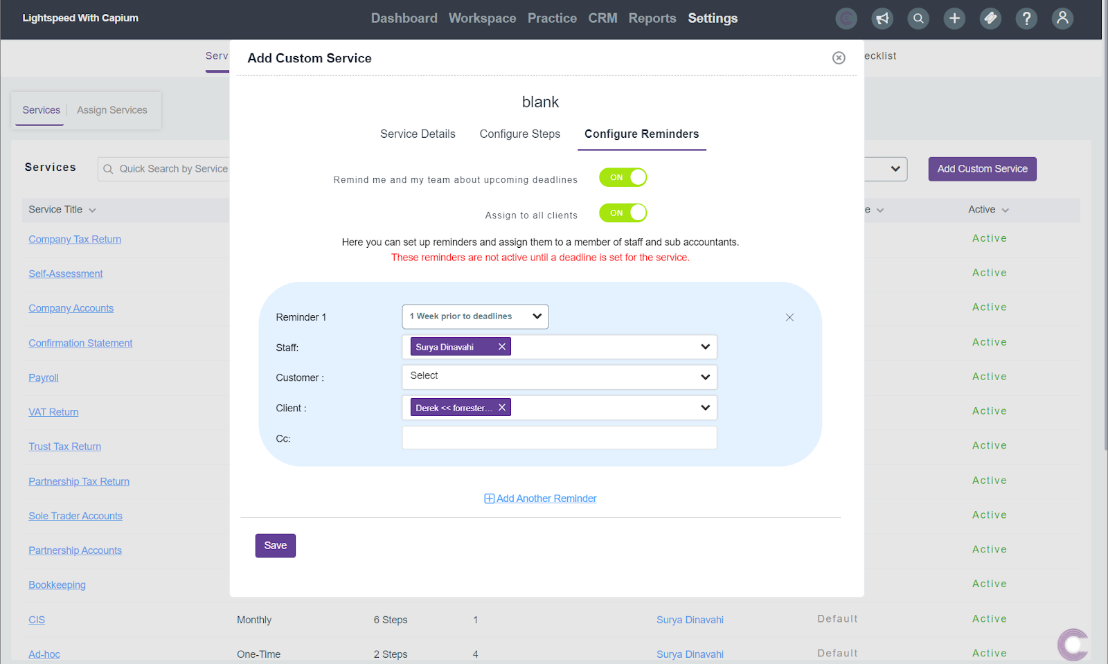 The final step is to configure reminders, which refer to custom reminders that can be created and sent out to notify both staff members and clients of an approaching deadline.