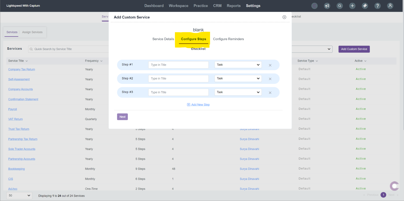 This involves clearly defining the services you offer, setting up the manager responsible for those services, setting a Standard Fee, estimated hours & custom reminders.