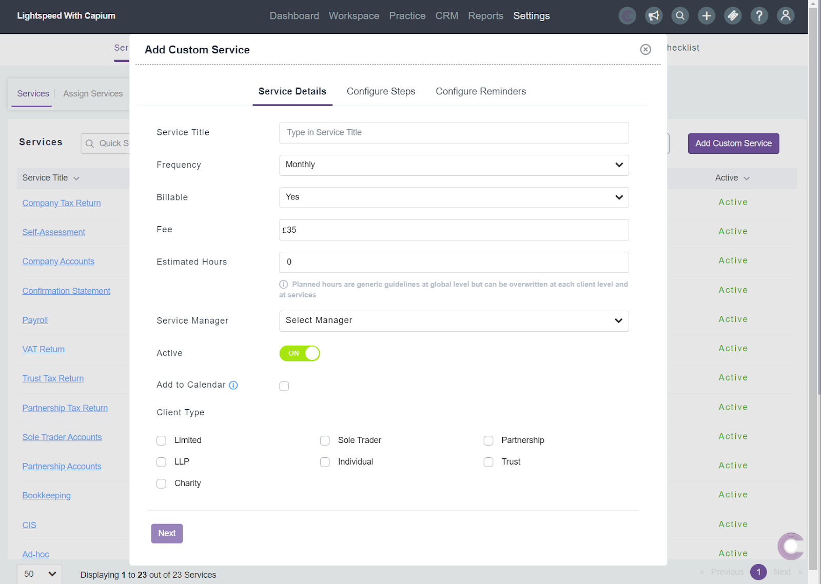 Choose the client type that you want the service applicable for. EG.is it specifically just for limited companies, or a variety of client types which you can tick.