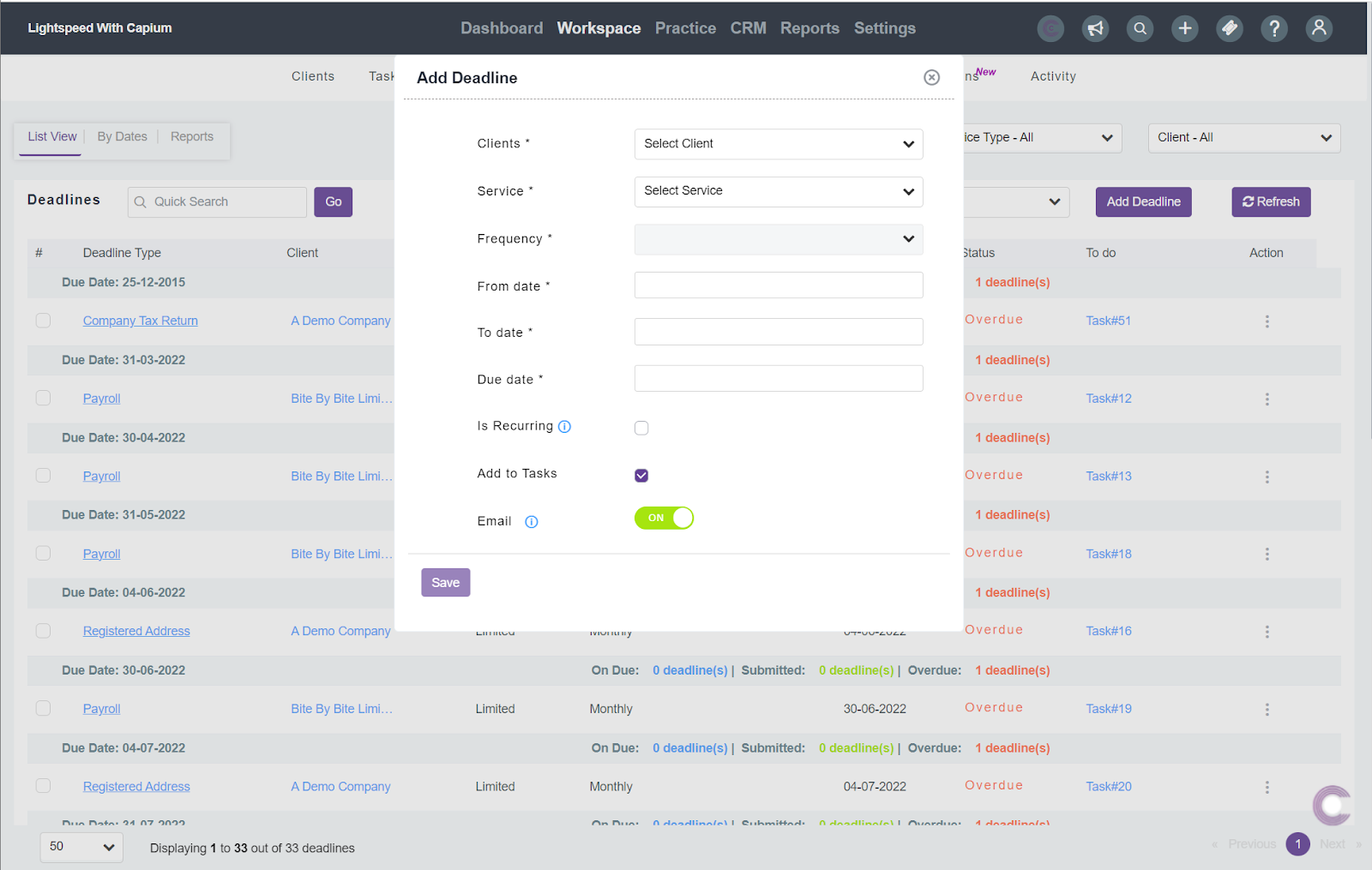 Deadlines can be created by navigating to Workspace>>>Deadlines & then select the ‘Add deadline’ button as shown below