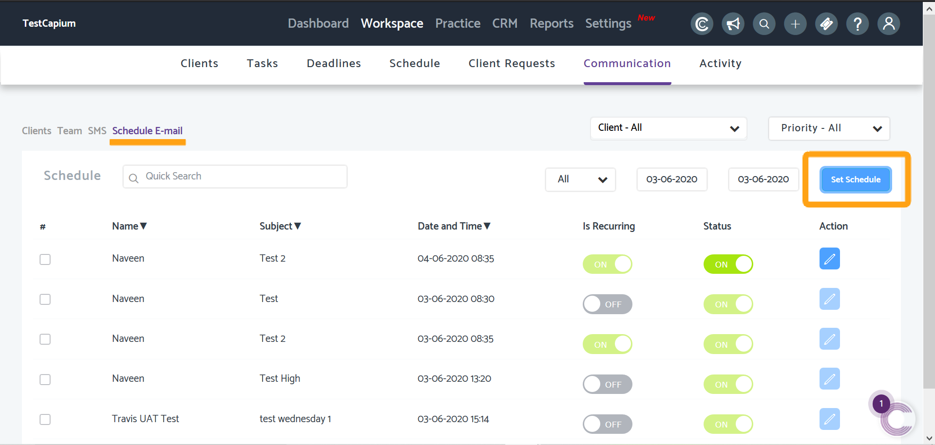 Navigate to the Schedule Email page using the navigation above and once there, click the 'Set Schedule' button to begin