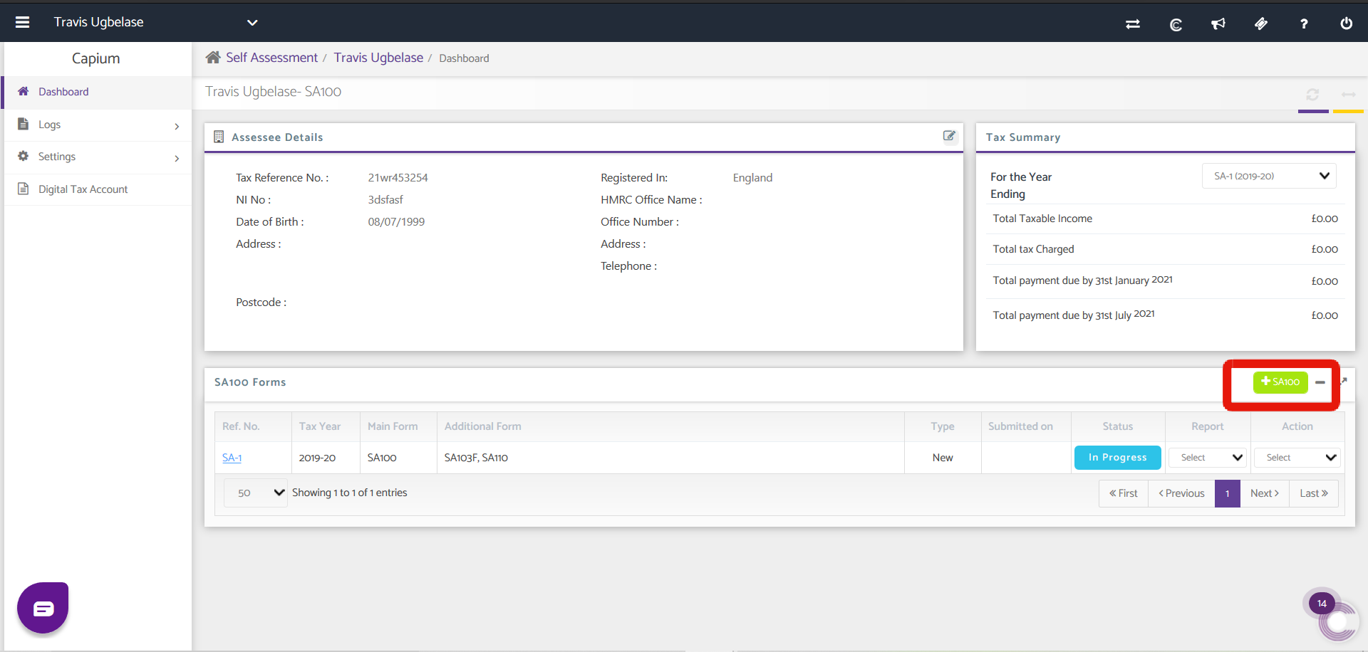 (Creating for the first time) Self Assessment > Add client > Sole Trader > Link to SA100 button