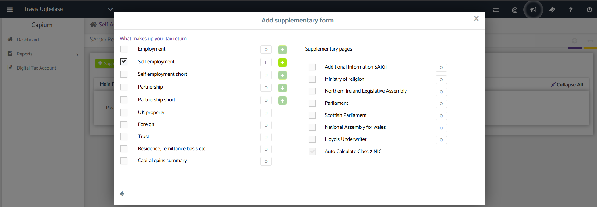 You will then be greeted with a pop-up list of all the supplementary forms you can add. Select Self Employment, where you will then be able to choose from the next screen, a list of all the businesses (Sole Traders) you originally linked