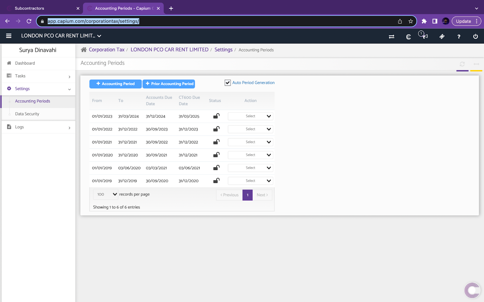 Next, once you go into a specific client of yours, ensure the accounting period/ any other prior periods are all set up here. Again, if already done in the bookkeeping or accounts production module, these will automatically sync through for you.