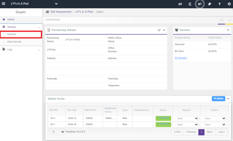 Navigate to the SA800 tab in the main dashboard and then select the partnership.