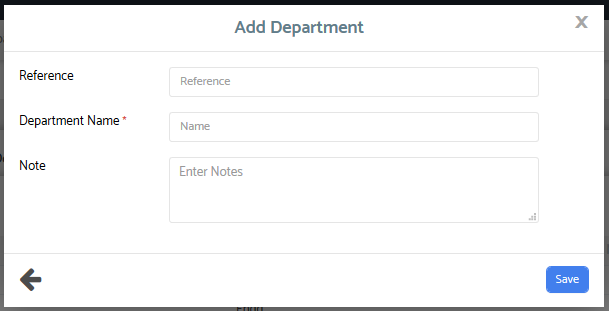 The first thing you will need to do is to create any and all relevant departments for that Employer. Do so using the blue 'Add Department' button on the top-right hand of the page. Here, you must enter a Department Name but can choose to enter a reference for that department as well as any notes should you wish.