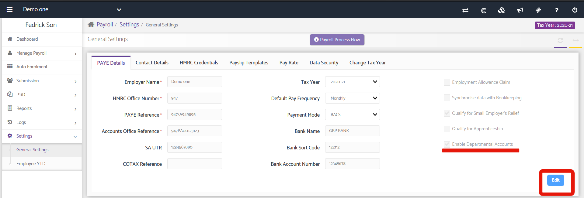 Before adding any Departments, you first need to enable this functionality. To do this, head to Settings > General Settings > PAYE Details > Edit