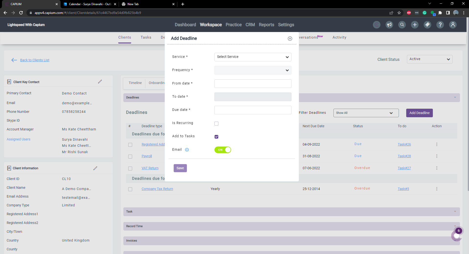 Navigation: Practice Management >> Workspace >> Clients >> Select a company >> Add a deadline