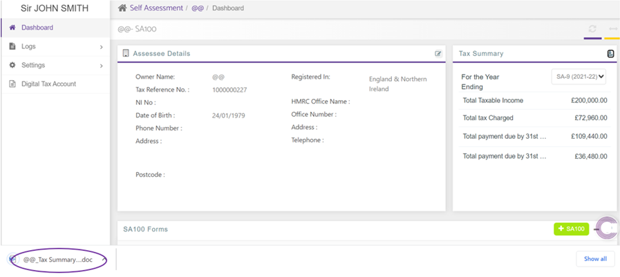 Following the navigation process, a user is able to download a summary of the SA return for a selected client by clicking the highlighted button above.