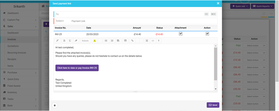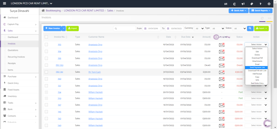 Following the navigation process, a user is able to send a link to get paid by selecting an invoice required to be sent, using the ‘Select Action’ drop-down menu and selecting the ‘Send Payment Link’ option. Alternatively, a user is able to send an email without the link by selecting the 'Email' option from the drop-down menu.