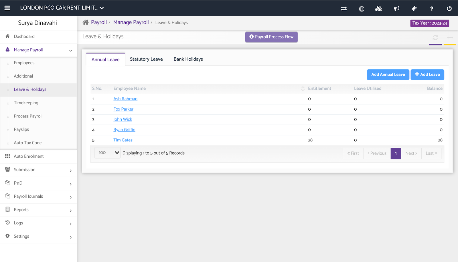 Select 'Add Leave' to input Annual Leave, Statutory Leave, and Bank Holidays.