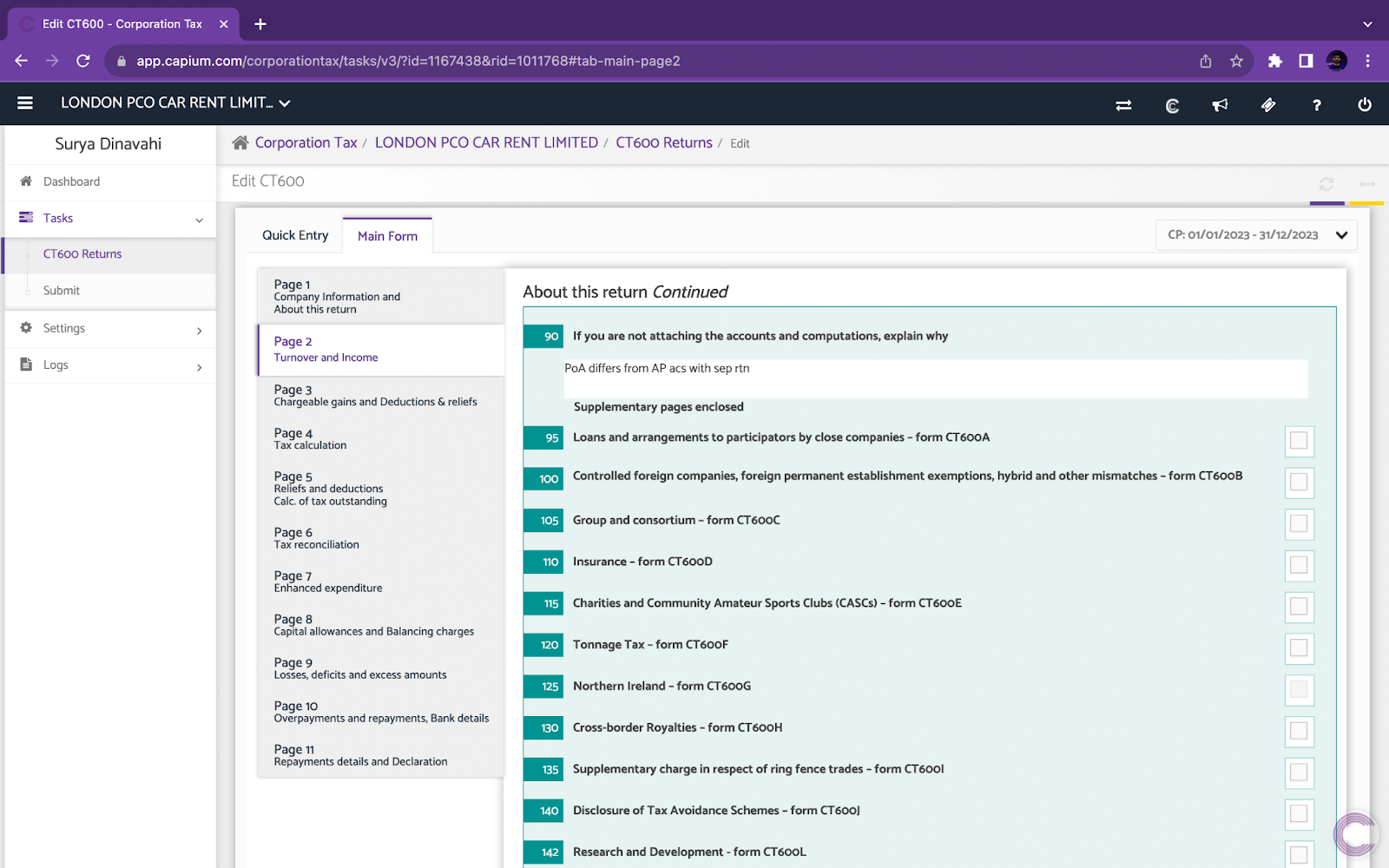 You also have the option to add supplementary pages to the CT600 on Page 2 and tick the relevant supplementary page.