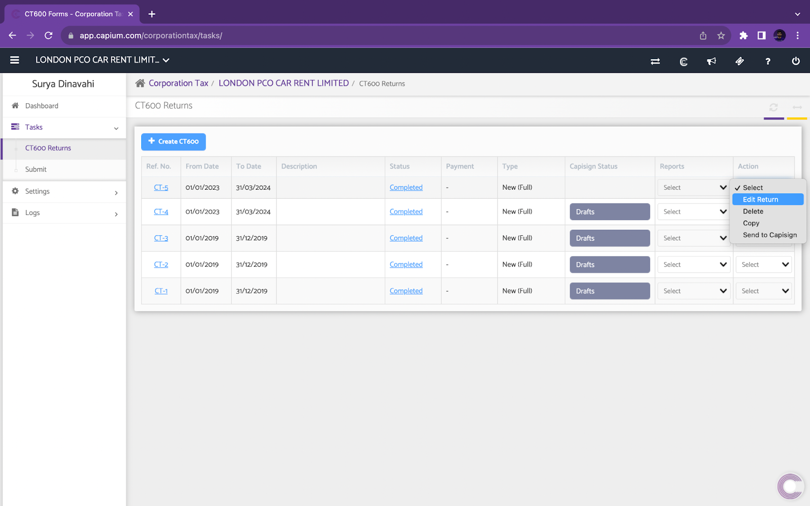 To prepare the CT600 return that has been added onto Capium, select the action dropdown button and proceed to ‘Edit Return’.