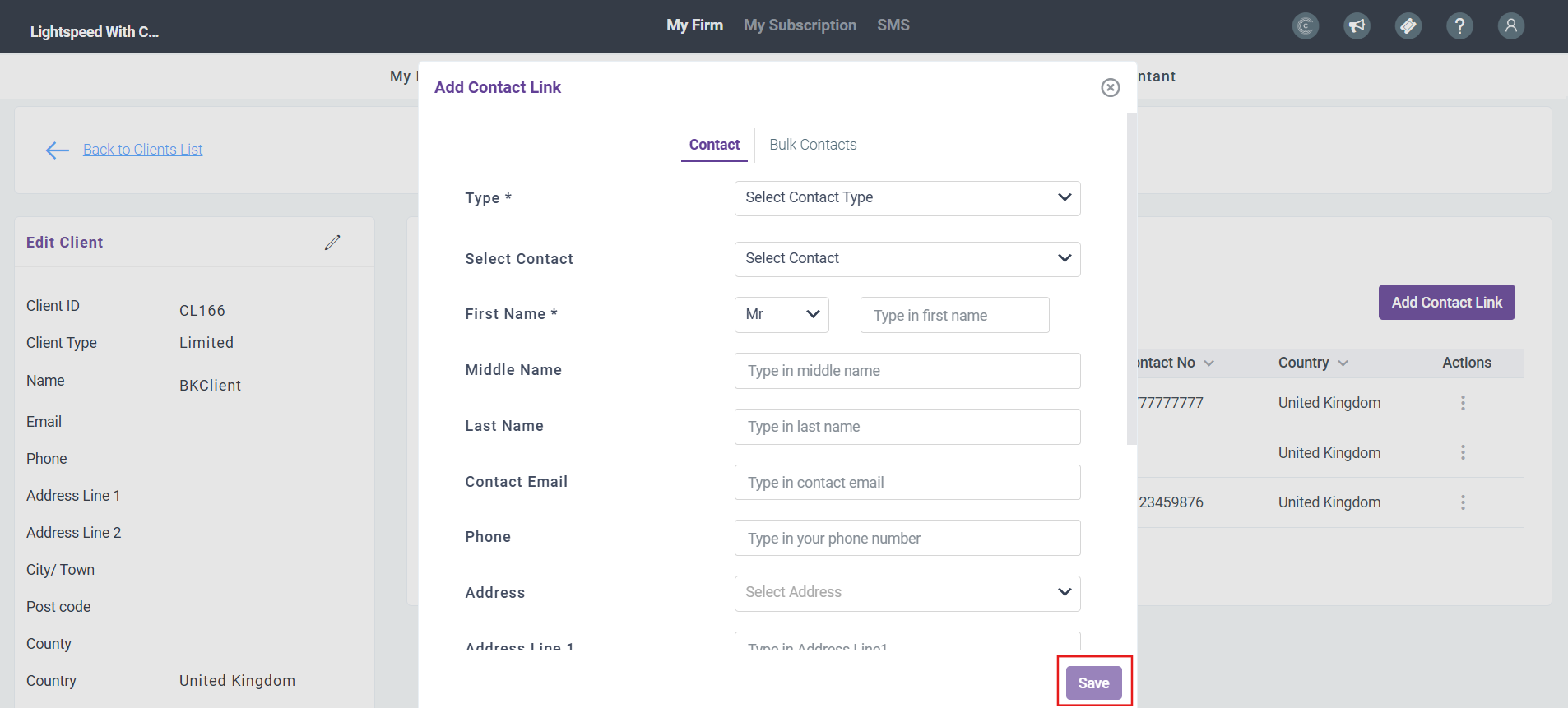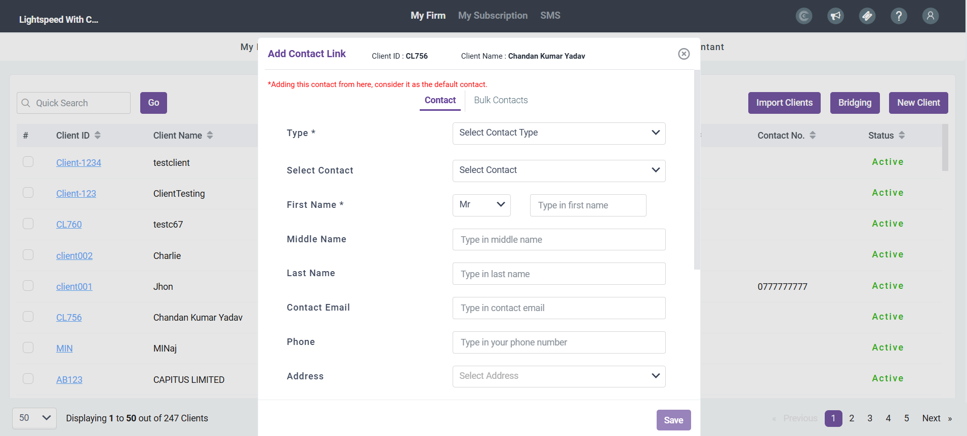 To add a client manually through the 'Add Contact Link' button, you first have to go into the client by selecting their client ID, you can then follow the steps below: