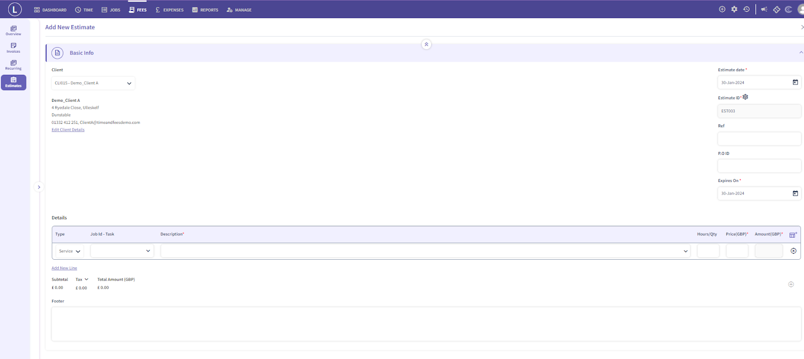 Navigation: Fees> Estimates> +Add Estimates