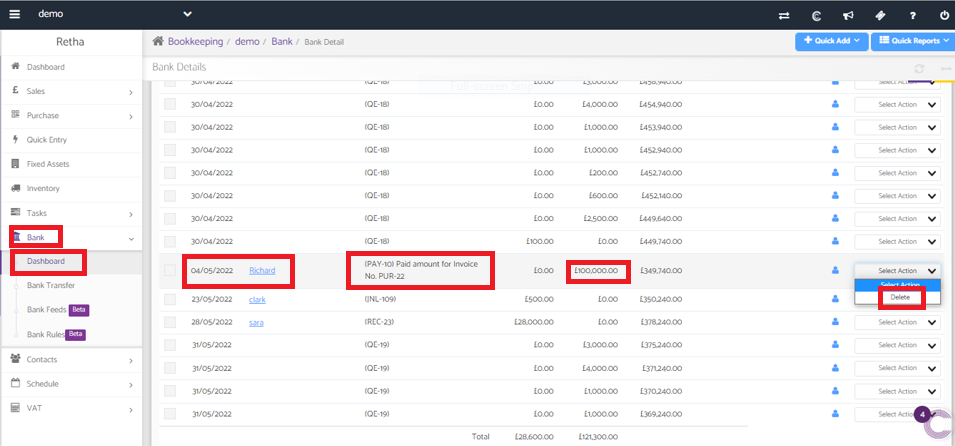 Bookkeeping>>Bank>>Dashboard>>Select the bank account (or) Cash in Hand account>>Action drop-down>>delete.