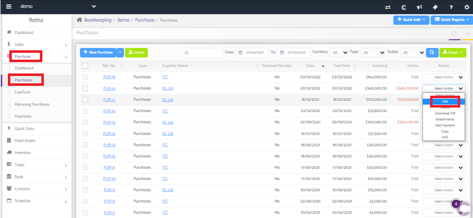 Now we can edit the transaction by navigating to Bookkeeping>>Purchase>>Purchases>>Action-drop-down>>Edit.