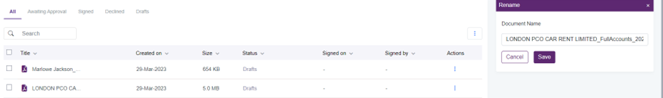 Once performed, a window with the "Rename" option will pop up, allowing a user to rename a document.