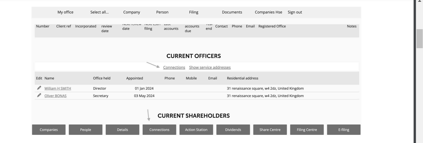 Once the Person has been added, you can select the company to which they’ve been appointed director. Go to Company > Select a company, then select Connections: