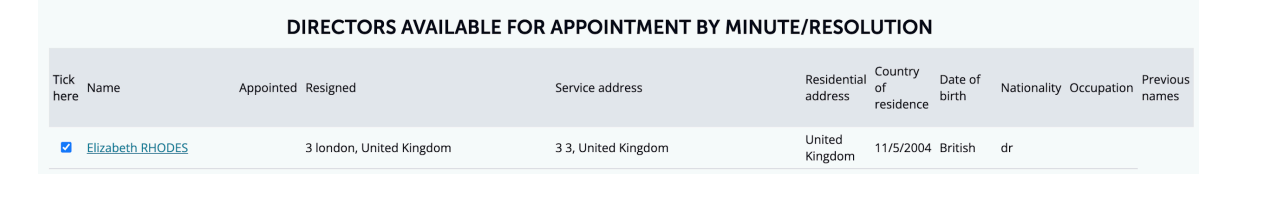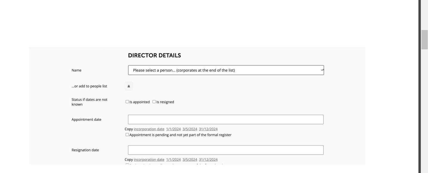 Now you can select the appointed Director from the list (corporates are at the end of the list). To prompt the prefilled AP01 form you will need to complete the Appointment date field, as well as the Appointment minuted field.