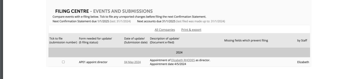 Now you can go to the Filing centre on the company’s homepage where the AP01 form will be waiting for review: