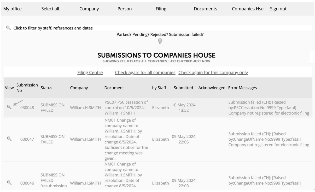 Click on the magnifying glass icon for more detail on the failed submissions: