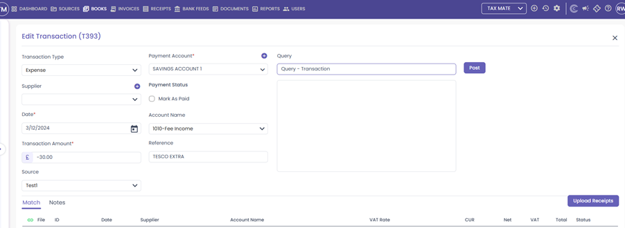 Navigation: Capium 365 > Books > Find the transaction you want to query > Type the query into the box in the top right > Click “Post” > The end user will be notified of their query by email