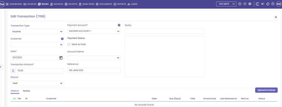 - Matching an invoice or purchase invoice directly to the transaction.
